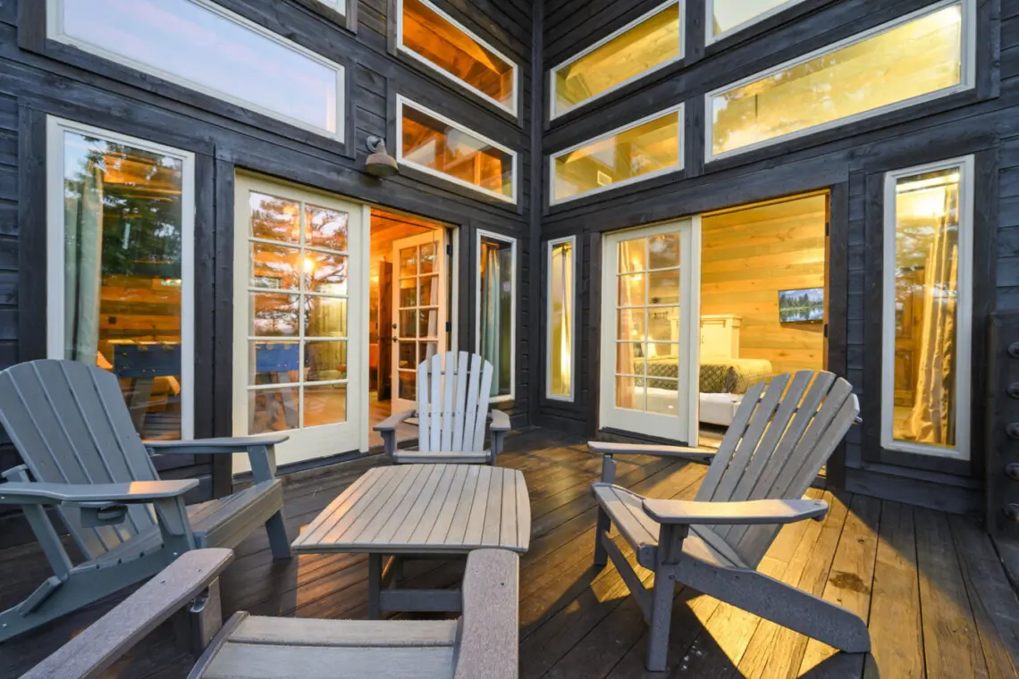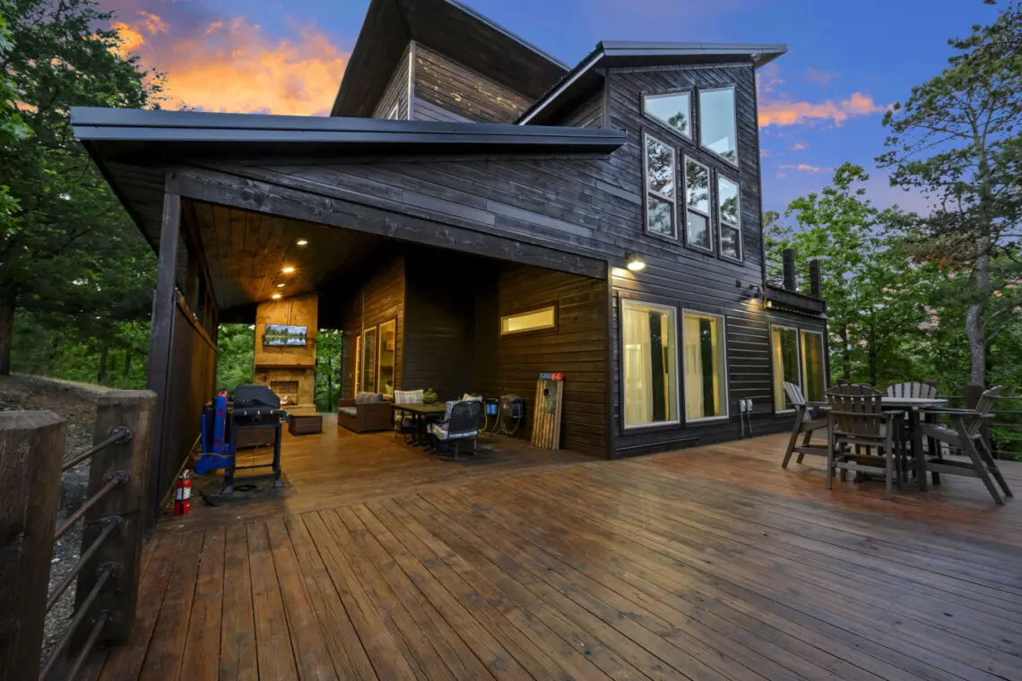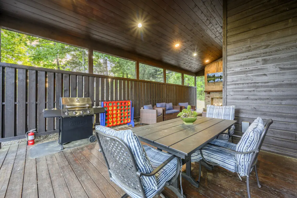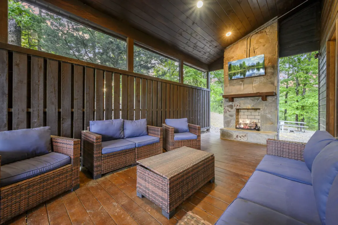 🌤️ Covered Deck: Lounge comfortably with outdoor seating, a Smart TV, and a cozy gas fireplace.