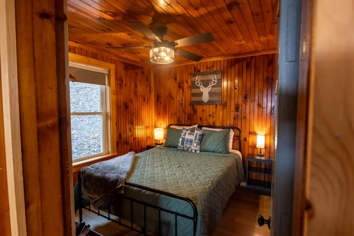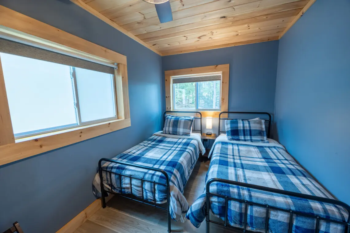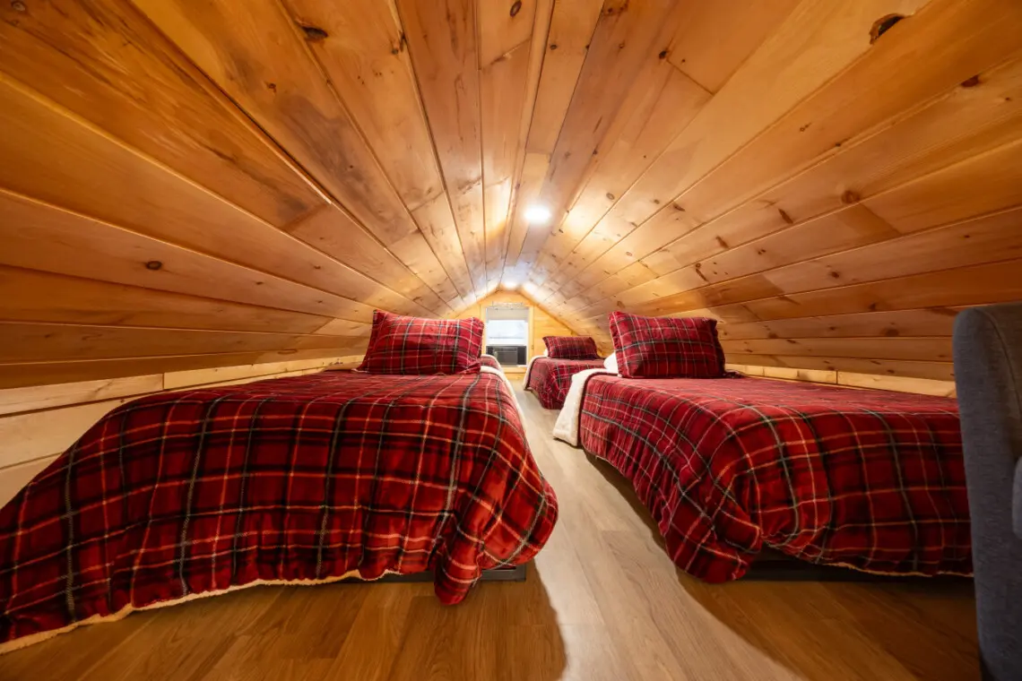☀️ Twilight (Cabin 5): Sleeps 6 guests with 2 queen beds and 4 twin beds.