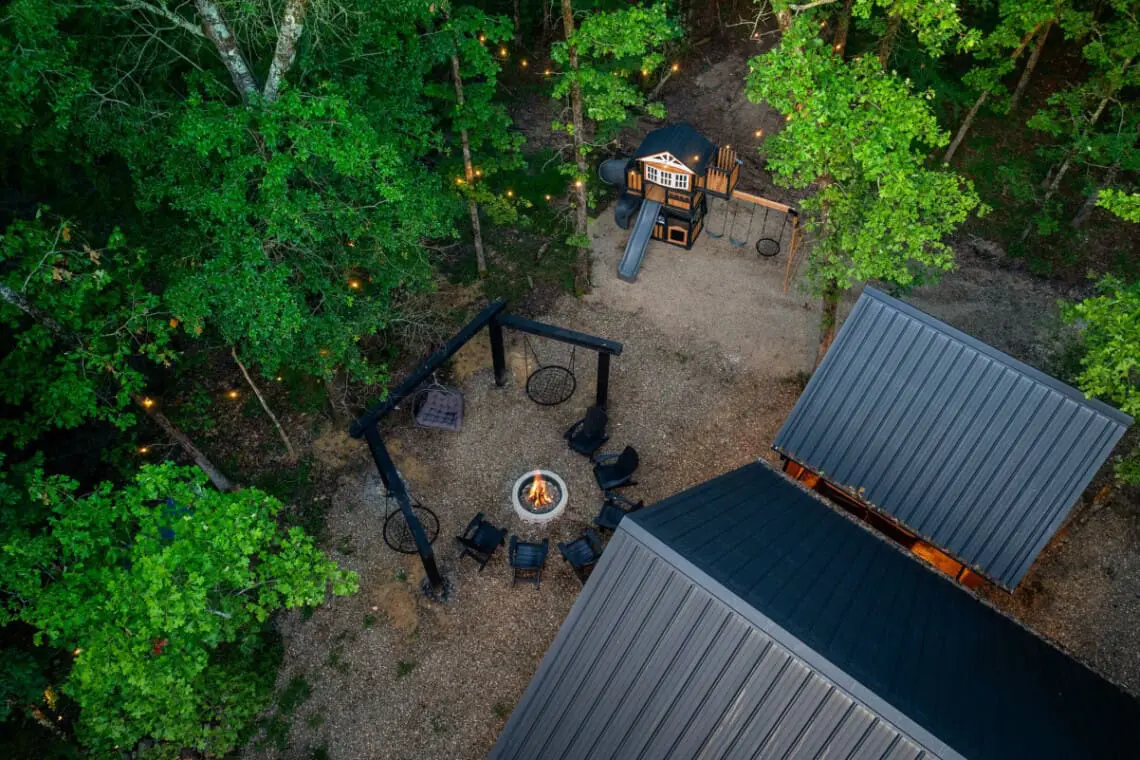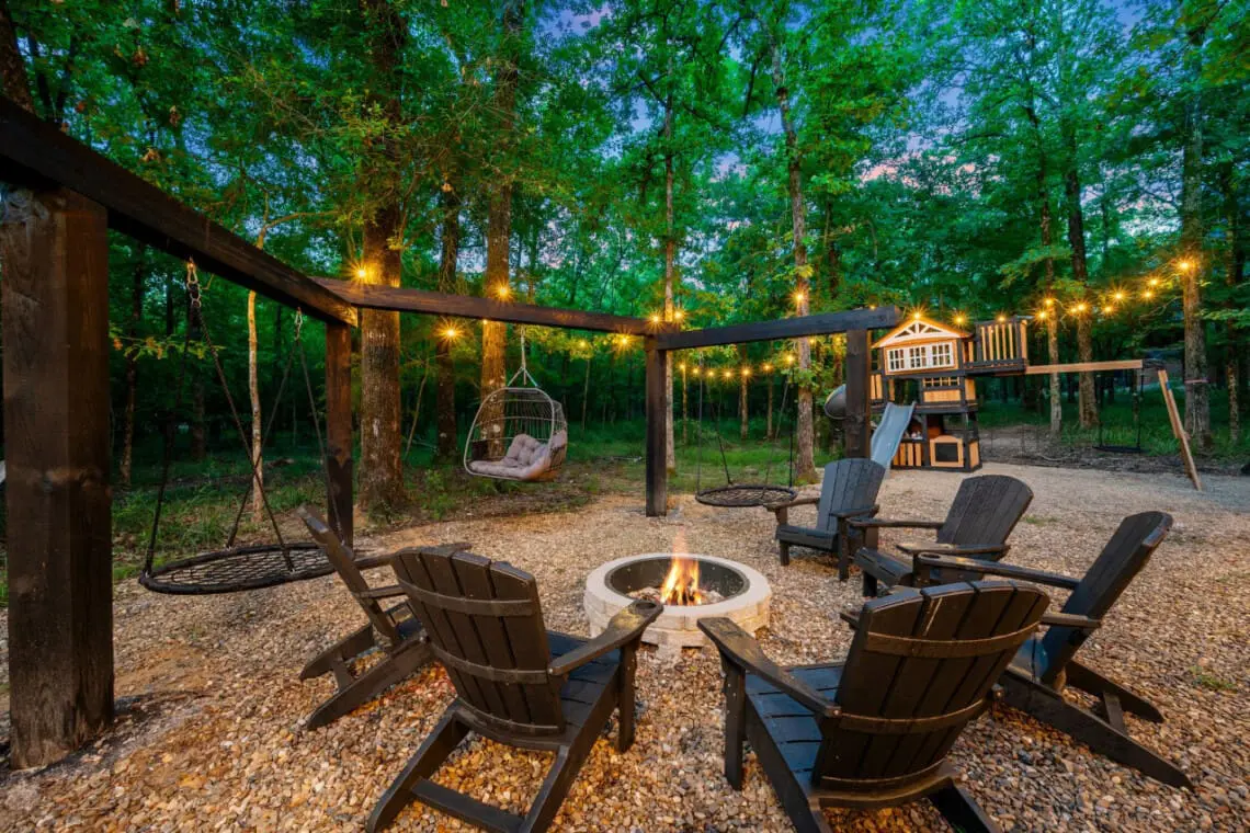 💎 Fire Pit Area: Gather around the fire pit under a large pergola adorned with swings and enchanting string lights, perfect for evening conversations and marshmallow toasting.