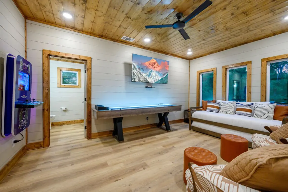 💎 Entertainment Hub: The game room, listed as the 4th bedroom, features a twin daybed with a trundle, a smart TV, shuffleboard, and an arcade game system for endless entertainment.