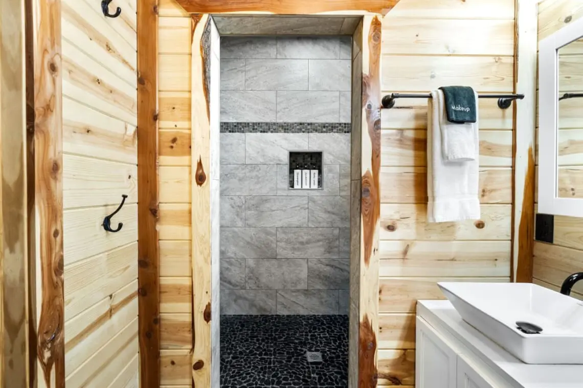 ๐ Walk-In Shower: Experience the unique walk-in shower with a black river rock pebble floor, providing a spa-like atmosphere.