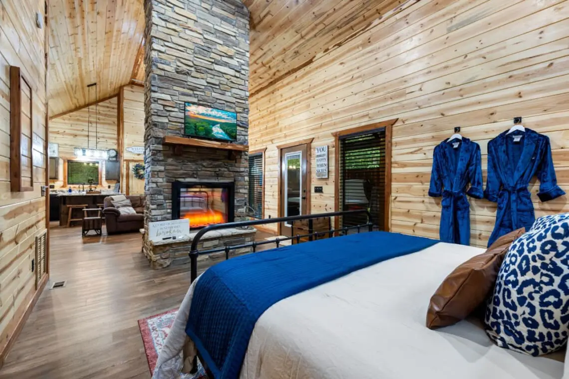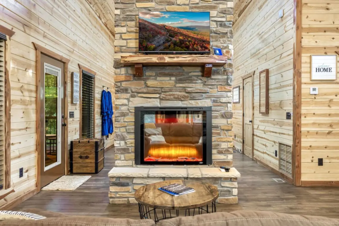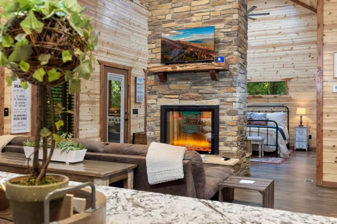 ๐ Open Concept Layout: Relax in the spacious studio-style living area with a floor-to-ceiling stone double-sided electric fireplace that adds warmth and charm.