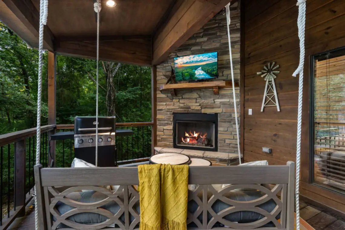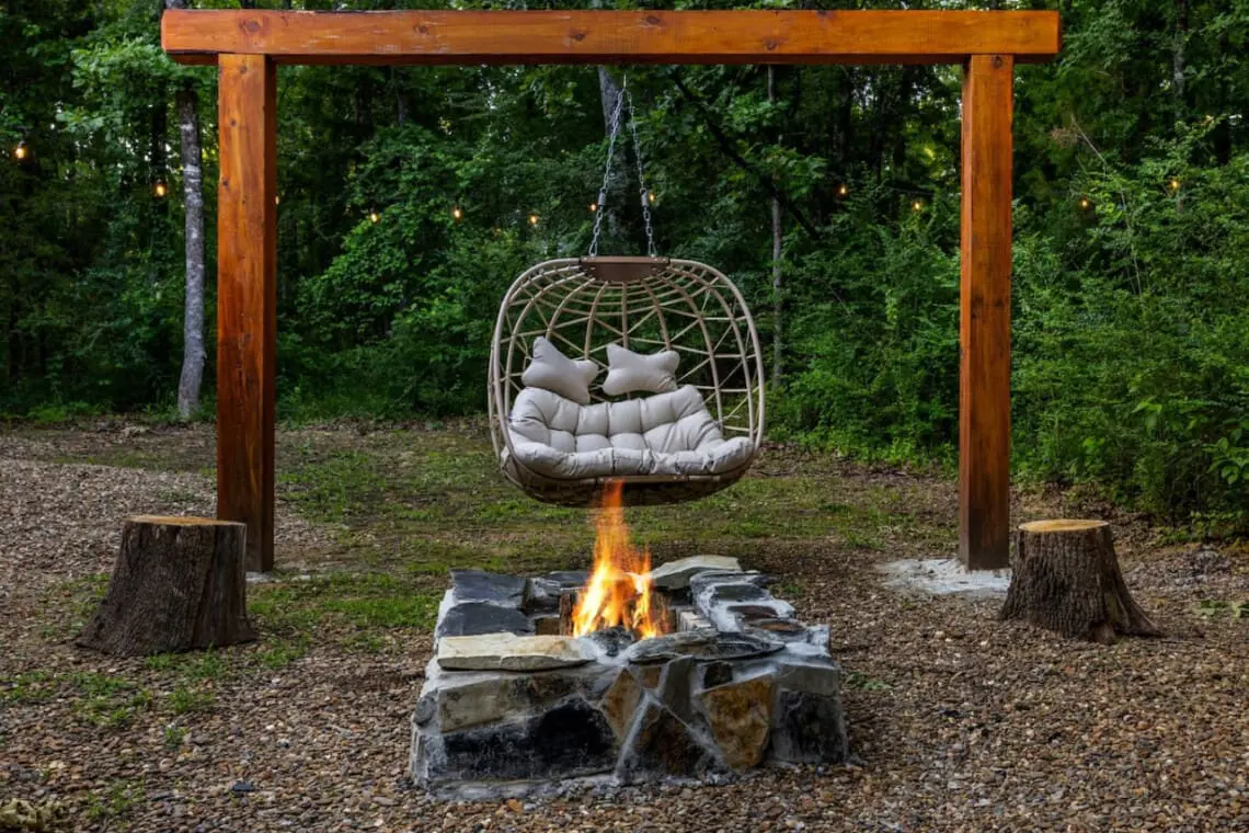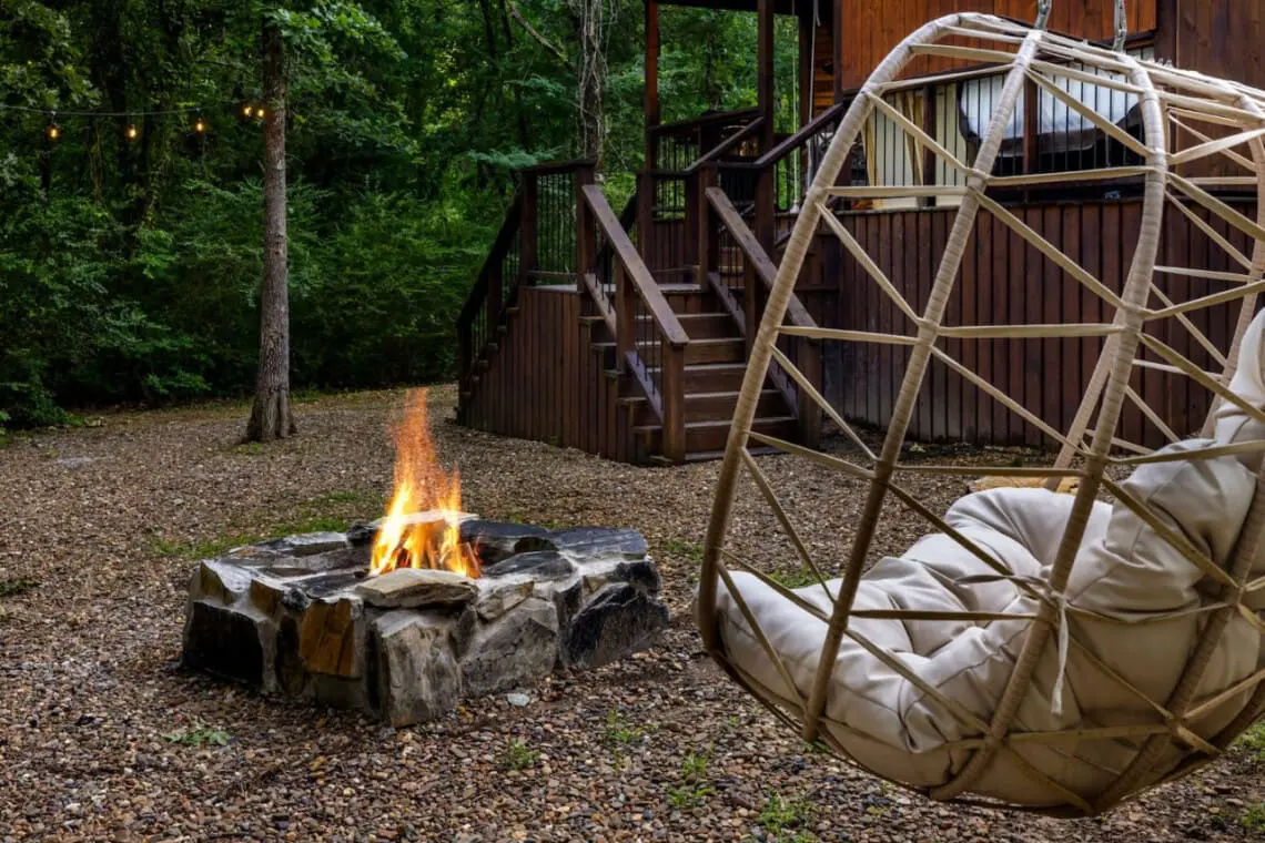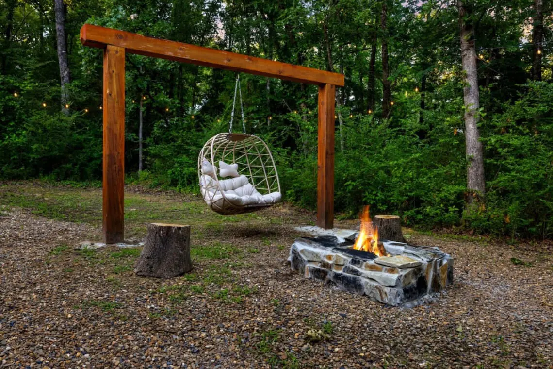 ๐ Fire Pit Area: Cozy up around the stone fire pit, complete with a couple’s egg chair swing, surrounded by enchanting string lights on a wooded one-acre lot with a seasonal creek nearby.