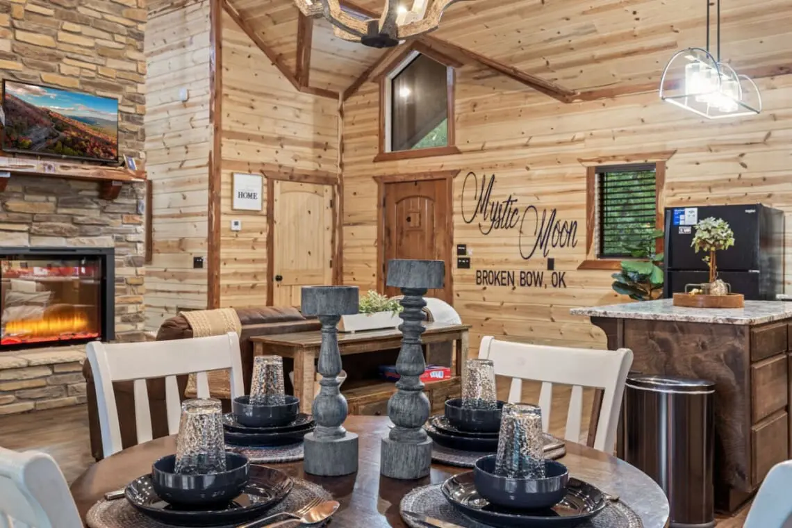 Welcome to Mystic Moon, an enchanting honeymoon retreat nestled in the heart of Broken Bow’s Kiamichi wilderness. This romantic cabin offers luxurious amenities and a serene natural setting, with convenient access to both Broken Bow and Hochatown’s top attractions. Experience the perfect blend of seclusion and adventure at Mystic Moon.