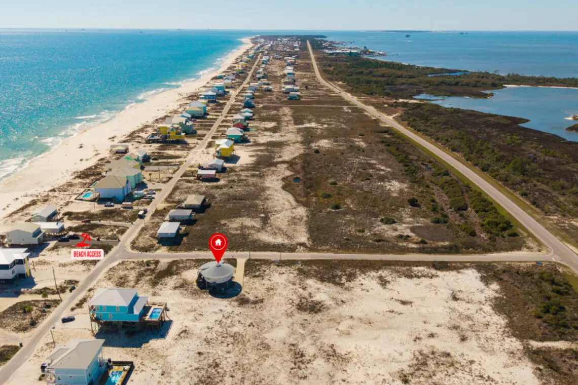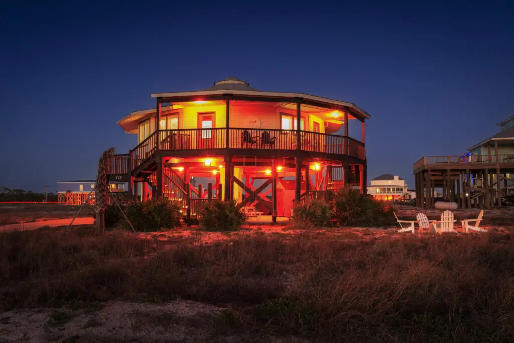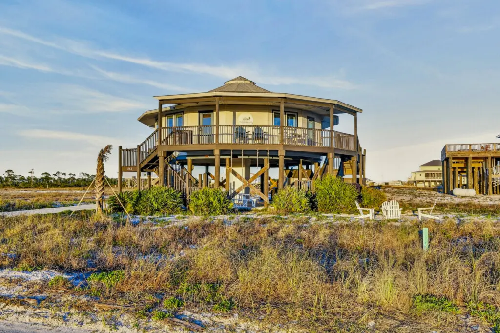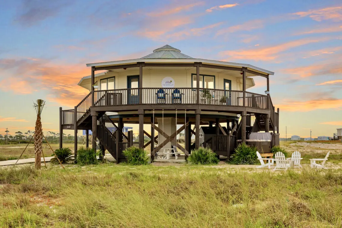 Nestled in a serene location with no other homes on our street and just a short 50’ walk to beach access, this Gold Fortified Round Beach House offers an unparalleled getaway. Bask in stunning views of both Mobile Bay and the Gulf of Mexico from every angle. Whether you’re seeking adventure or relaxation, “The Good Life” is your perfect coastal retreat.