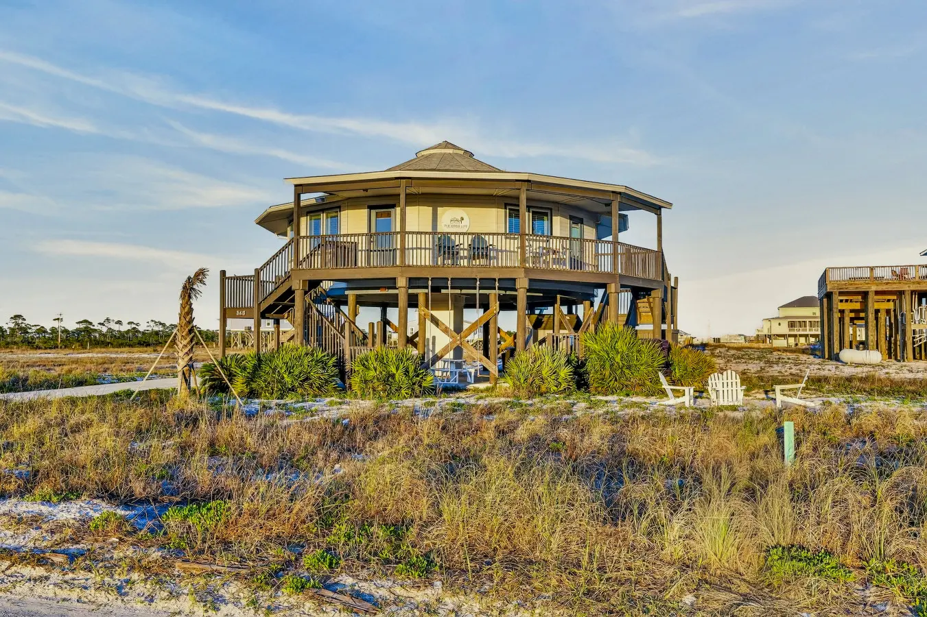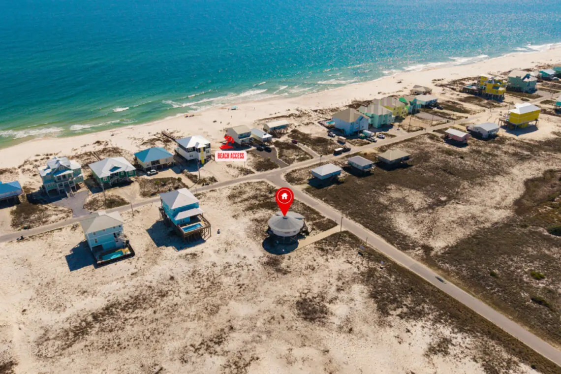 Welcome to “The Good Life” in Gulf Shores, Alabama! Just 50’ from beach access and surrounded by stunning views of Mobile Bay and the Gulf of Mexico, our Gold Fortified Round Beach House offers a unique and serene escape. These are our highlights:
